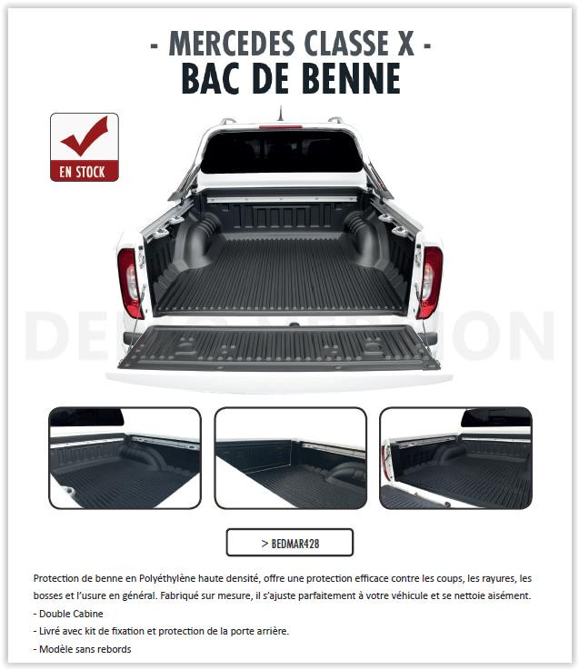 Hard top, couvercle alu, volet coulissant Roll-N-Lock, pare buffle homologué, plateau de charge coulissant, protèges carters, second étage pour optimaliser tout le volume de chargement, bac de protection de benne, ... : nous avons tous les accessoires pour le Mercedes Classe X.